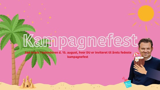 For at hylde alle jer gode frivillige kræfter og skabe kampgejst afholder vi en udendørs kampagnefest fredag 15. august kl. 17.30 - 20.30 i borgmesterens have, Tesdorpfsvej 46. Tilmelding senest 12. august i denne begivenhed på Facebook-gruppen eller til Solveig på sms 4276 1803. Medbring et tæppe til at sidde på. Vi sørger for pizza, øl og vand.