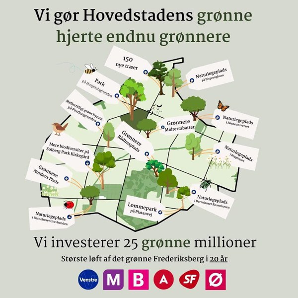 Aftalen gør byen markant grønnere med 25 mio. kr. til en ny park i Hospitalshaven, naturlegepladser, op mod 150 nye træer samt et grønnere Nordens Plads, en mere biodivers Solbjerg Parkkirkegård og meget mere.